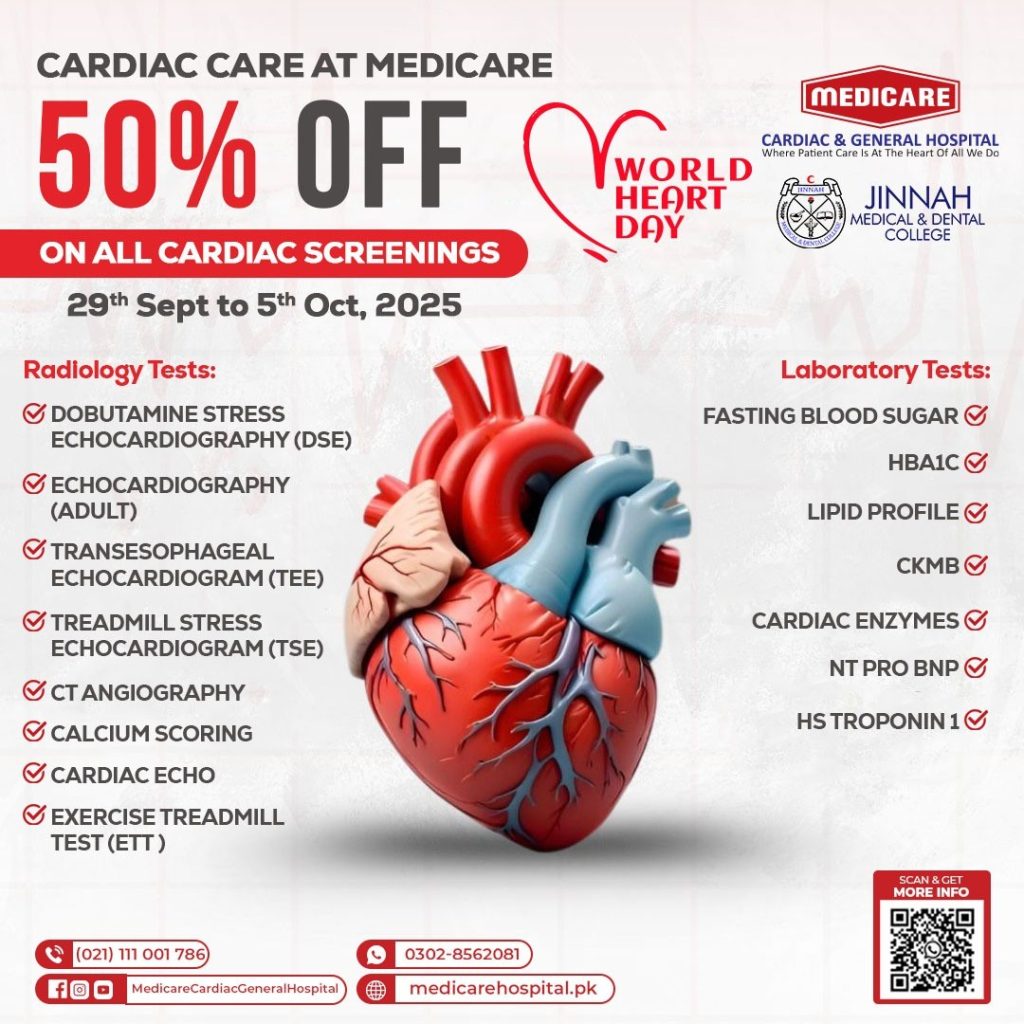 In pursuit of higher standards in patient care, undergraduate and post graduate teaching and vocational training at all levels of ancillary staff, Jinnah Medical and Dental College has established a 120 bed hospital to house its Department of Cardiology, Cardiothoracic Surgery and other surgical services. Medicare Cardiac & General Hospital is providing services from 1st December , 2014. The Hospital is offering comprehensive diagnostic and therapeutic services to patients with cardiovascular diseases and other diseases. Clinical facilities comprise of dedicated in-patient cardiac wards, private rooms,10 bed ICU, 13 bed CCU, 4 HDU, 7 OT’s and 2 Cath labs.